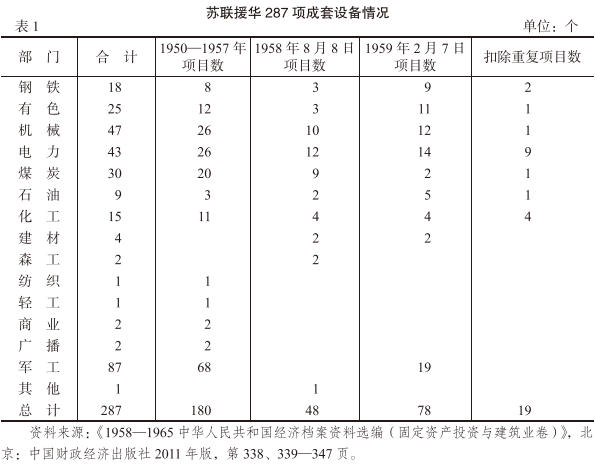 1959年初,国家计委同苏联来华进行1960年援华设备分交的专家组,就苏联援华建设项目数量和计算方法进行核对,确定苏联援华成套项目为287项。采取的计算方法是按照中国所列的建设单位计算,如鞍山钢铁公司和大石桥镁砖厂在协议中是2项,但在中国是1个建设单位,算做1项;哈尔滨铝加工厂前后签订过4次协议,但只算1项;江西钨矿按照协议为1项,但按建设单位为3项。1958年以前签订协定的项目为180项。“二五”时期苏联援华项目125项中,由于19项是1958年以前项目的后续项目,没有包括在内,只计算了106项。另外包括1958年8月3日签订的1个军工项目。以上共计287个项目,具体情况如表1。