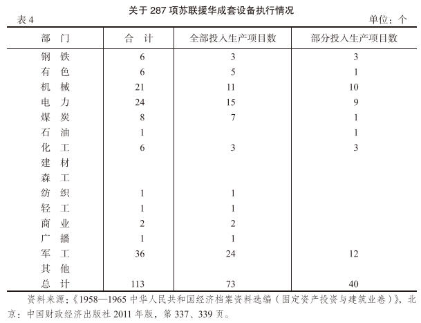 关于287项的执行情况 截至1958年底,苏联援华成套项目287项中,全部和部分投入生产的有113项,其中全部投入生产的73项,部分投入生产的40项。具体情况如表4。
